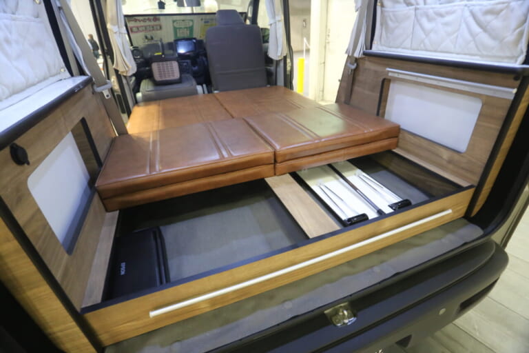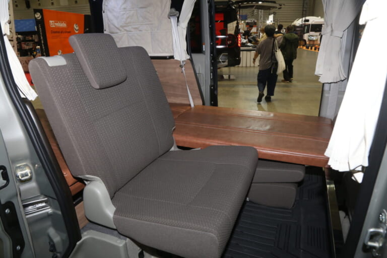 ベースはスズキエブリイのターボ4WD。セカンドシートを折りたためば完全フラットなラゲッジスペースが確保できるエブリイのパッケージングを活用し、全長2000mm×全幅1200mmのベッドを設置。宿泊は2名まで可能だが、片側のセカンドシートを起こし、もう片側はベッドスペースに、といったソロユースといったシートアレンジも可能となっている。