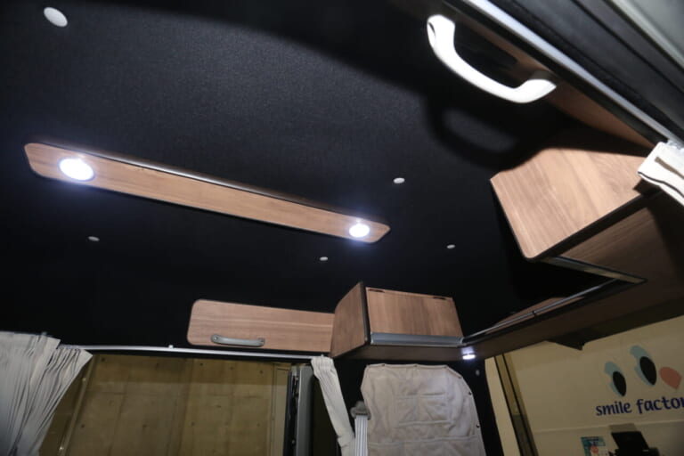 天井には中央部分に明るいLED照明も完備。ベッドの枕元にあたる部分にもLEDをセットする。さらにリヤのラゲッジスペースのサイド左右にはマガジンラックを設けたキャビネット、天井部分の左右には収納庫も装備。ラゲッジ側のベッド下にも収納スペースを確保している。またマガジンラックには12Vのシガーソケットもセット。取材車両はベーシックパックのため12Vのみだが、100VのコンセントやUSB電源もオーダーで設置することができる。
