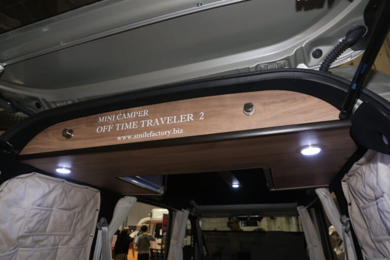 島根県益田市の軽キャンパービルダー「スマイルファクトリー」が手掛けた軽バンコン「オフタイムトラベラー2」。スズキエブリイベースの2名使用設定の車中泊仕様モデルになる。