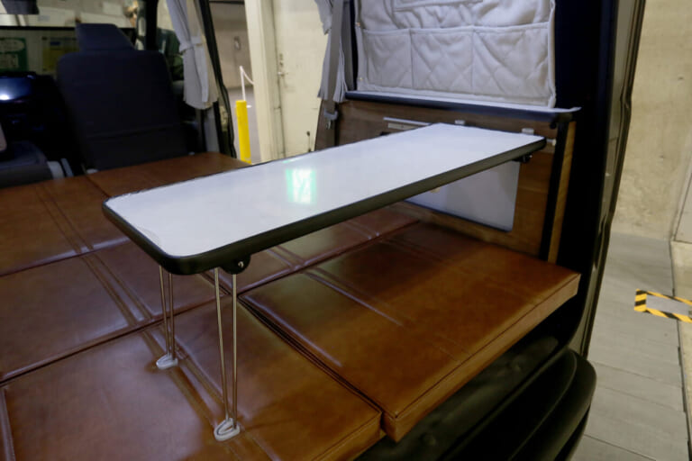 移動テーブルも標準装備。リヤ左キャビネットのレールにセットして車内で使用できるほか、リアゲートを開けて車外でもキャンピングテーブルとして活用OK。ちゃぶ台にもアレンジできる。