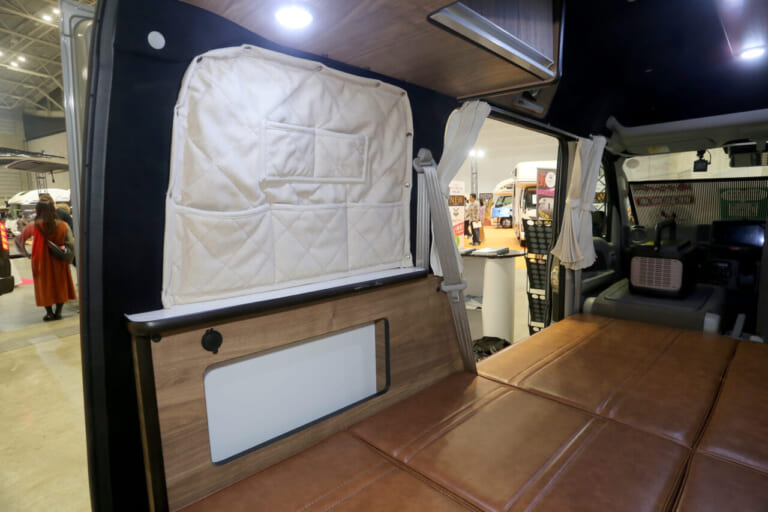 室内の壁にはスマイルファクトリーオリジナルの断熱材を施工。寒さ暑さも問題なしだ。またリヤクォーターウインドウにもポケットを装備した断熱マットを装着できる。