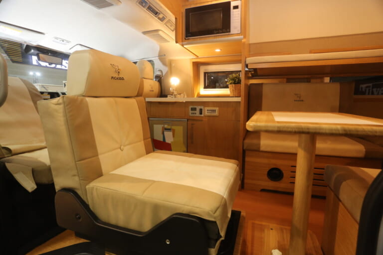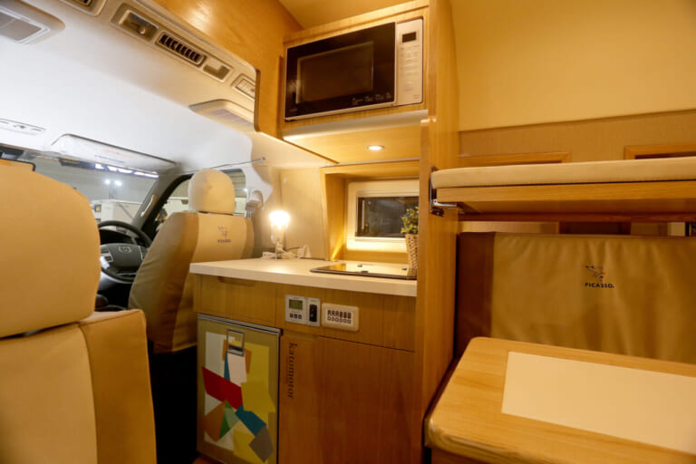 広々としたインテリアはベッドなどの機能性も特筆もの。またキッチンには電子レンジや冷蔵庫も完備し、さらに室内最後尾にはトイレも設けている。まさに「居住」空間になっているわけだ。またこのパブロは基本的なパッケージのほか、100VのエアコンやFFヒーター、リチウムサブバッテリーやソーラー充電システム、オーディオなどオプション装備も多数ラインアップしている。