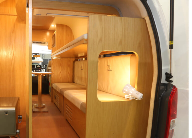 ベース車はハイエースの標準ボディ・ハイルーフ車のワゴンGL。セカンドシートを含めたリヤの居住スペースはすべて同社のハンドメイドで、センターには前向き/後ろ向きにアレンジ可能なシートとテーブル、キッチンをセット。リア側には二段ベッドにもなるベンチシートとトイレスペースを完備している。