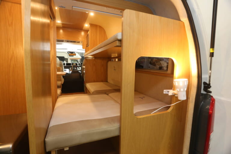リアの横向きベンチシートは宿泊時には二段ベッドとしてアレンジ。ファブリックにはピカソの代表作のモチーフも織り込んでいる。