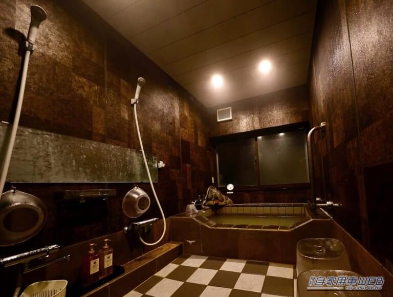 ペンション陽だまりの施設内にある源泉かけ流し天然温泉。「疲労回復」「冷え性」「筋肉痛」など、様々な効果のある鉄分豊富な褐色の温泉だ。