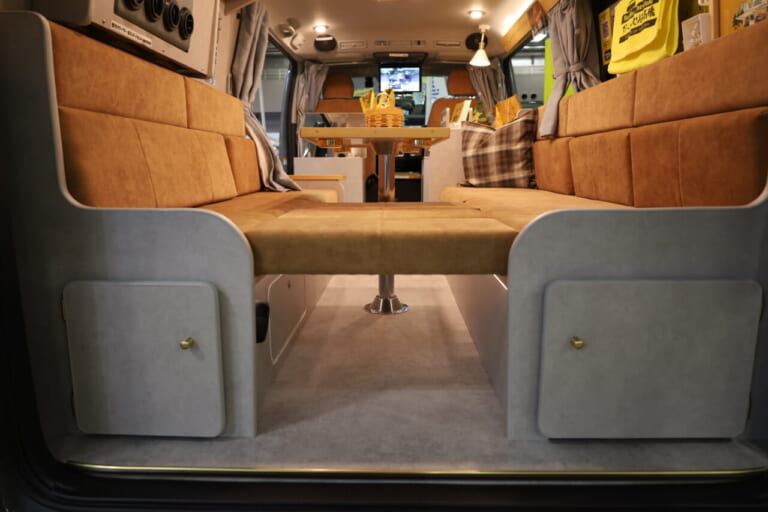 乗車定員5名で就寝定員は2名。ベッド下は収納スペースとして便利に使える。