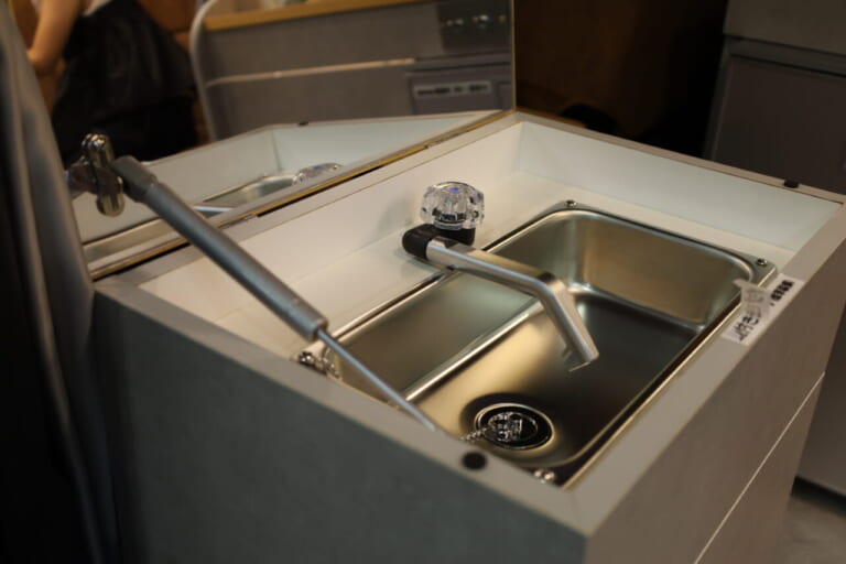 スライドドアを開け、助手席のすぐ後ろにあるのが鏡付きのシンク。出入り口に鏡があれば、旅先で観光に出かける前の身だしなみのチェックにも便利だ。シンクを使わないときはフタになる。