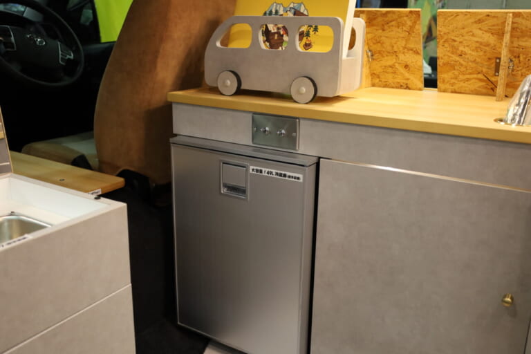 運転席後部には大容量49Lの冷蔵庫を標準装備。カセットガスコンロも標準装備するから車内調理でクルマ旅の食を豊かにし、旅先で手に入れたお土産もたっぷり持ち帰れそうだ。