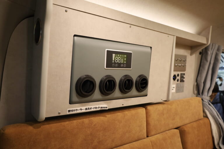 車載クーラーは壁掛け家具ボートセットで設置。寒い季節に備えてFFヒーターも装備。クーラー対面のリア窓パネルにはマグネットやフックなどを使い壁掛け収納ができる「まぐねっぴー」を装備する。