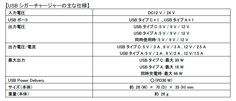 USB Type-CポートはPower Delivery (PD) 3.0対応で、最大30Wの高出力での急速充電が可能なほか、12V/24V車両にも対応しているため、普通乗用車から大型トラックまで幅広い車両で利用することができる。