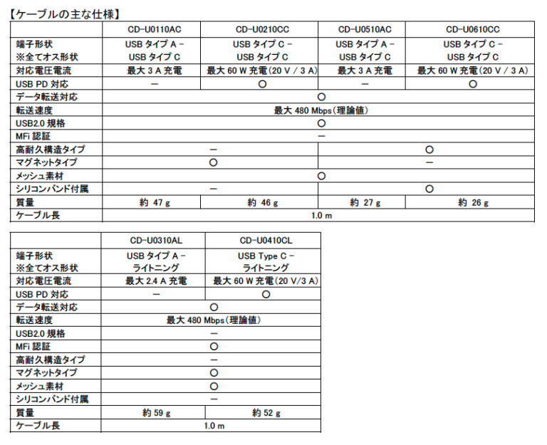 ケーブル製品は、磁力でケーブルを簡単にまとめられるマグネットタイプと、断線や折り曲げに強く柔軟性にも優れた高耐久構造タイプをラインアップ。
