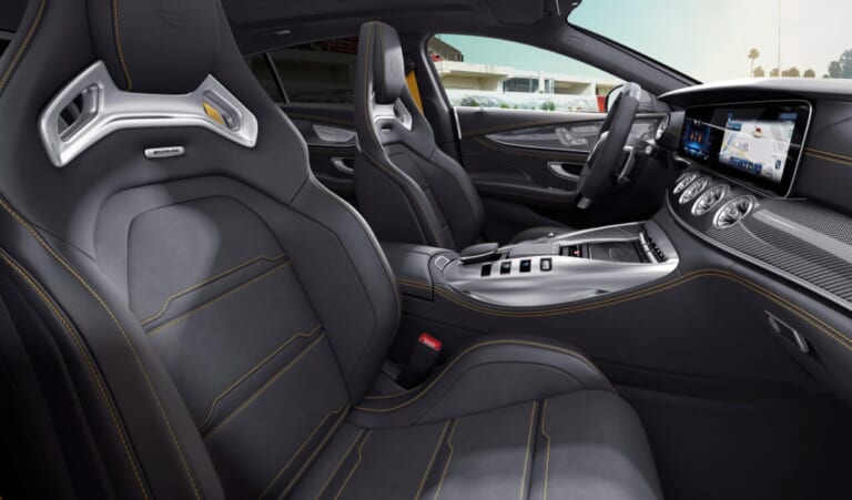 インテリアには、本モデル限定の「AMGパフォーマンスステアリング (カーボンファイバー/MICROCUT)」、「Final Edition」バッジ付きセンターコンソールに加え、有償オプションの「フルレザー仕様(ナッパレザー/MICROCUT、ブラック (イエローステッチ入))」、「AMG パフォーマンスシート」、「イエローシートベルト」、および上位モデル専用の「AMGカーボンインテリアトリム」が標準装備される。