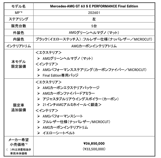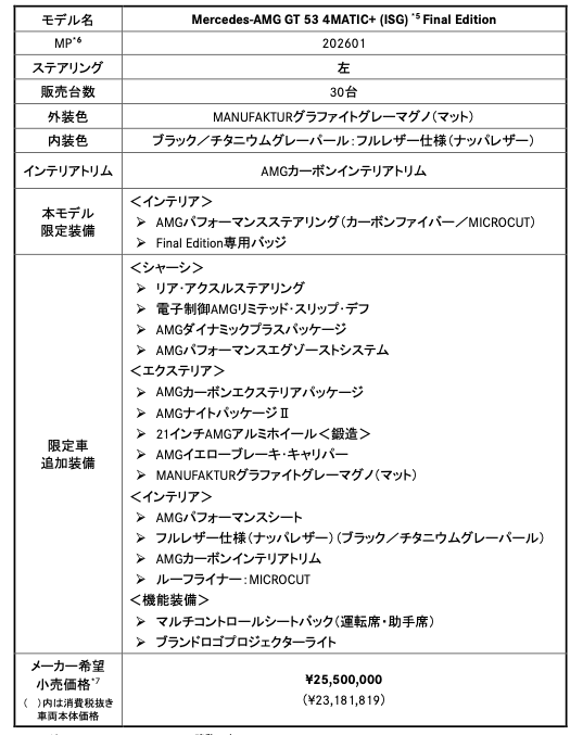 メルセデス・ベンツ日本は、特別仕様車「Mercedes-AMG GT 53 4MATIC+ (ISG) Final Edition」と「Mercedes-AMG GT 63 S E PERFORMANCE Final Edition」を発表した。価格は「GT 53 Final Edition」は2550万円(限定30台)、「GT 63 S E PERFORMANCE Final Edition」は3685万円(限定5台)。