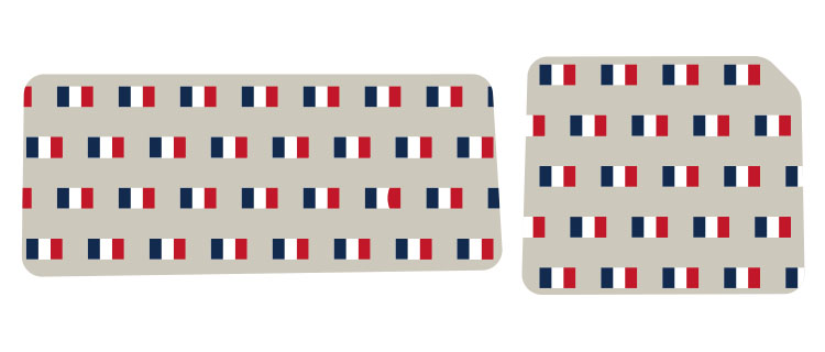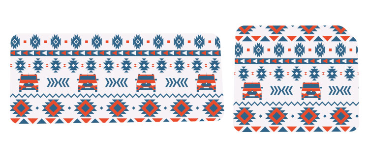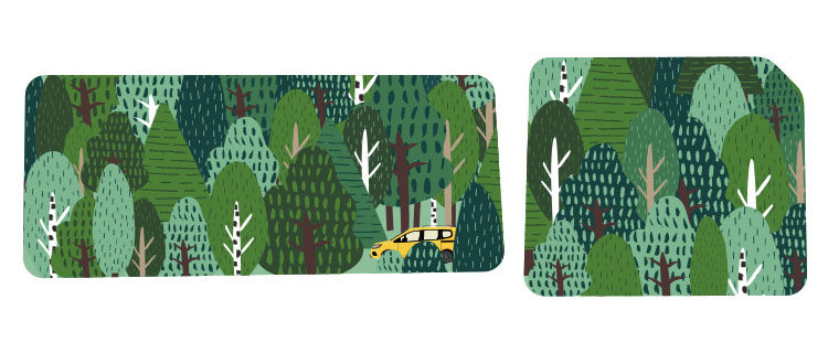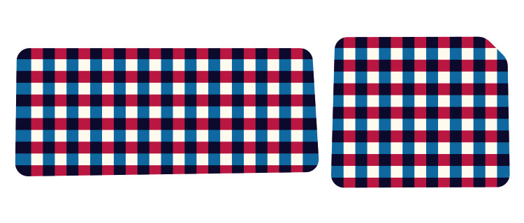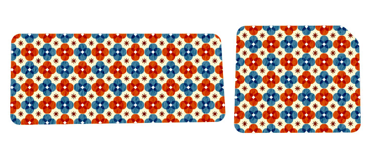 木目や合板といったナチュラルな素材感を想起させるデザインは、カングーに積み込まれるアウトドアギアとの相性が良い。一方でギンガムチェックや花柄などの柔らかい印象の柄は、日常使いのカングーに親しみやすさを加える要素となる。また、トリコロールフラッグや幾何学模様などは視覚的なアクセントとして強い存在感を持ち、シンプルな車内空間にメリハリをつくることができる。