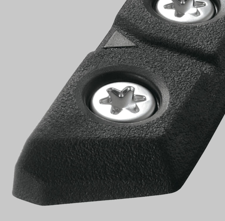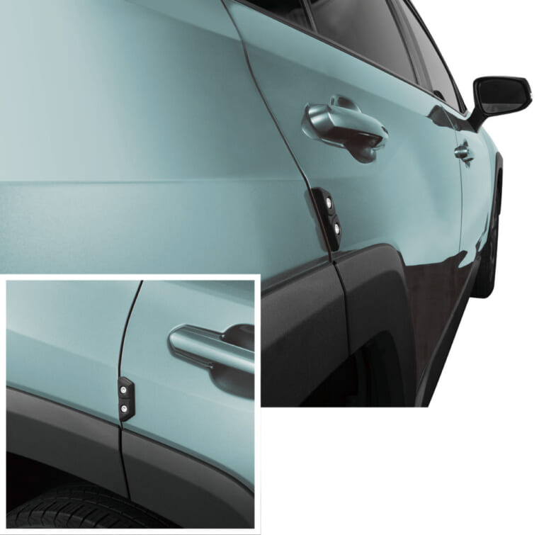 ドアガードクロスは、素材にエラストマー樹脂を採用しているので、傷つきやすいドアの外側のエッジを、より効果的に保護してくれる。また、凹凸のあるデザインとシルバーメッキをほどこしたボルト風のパーツで、車両にタフな印象を演出できる。