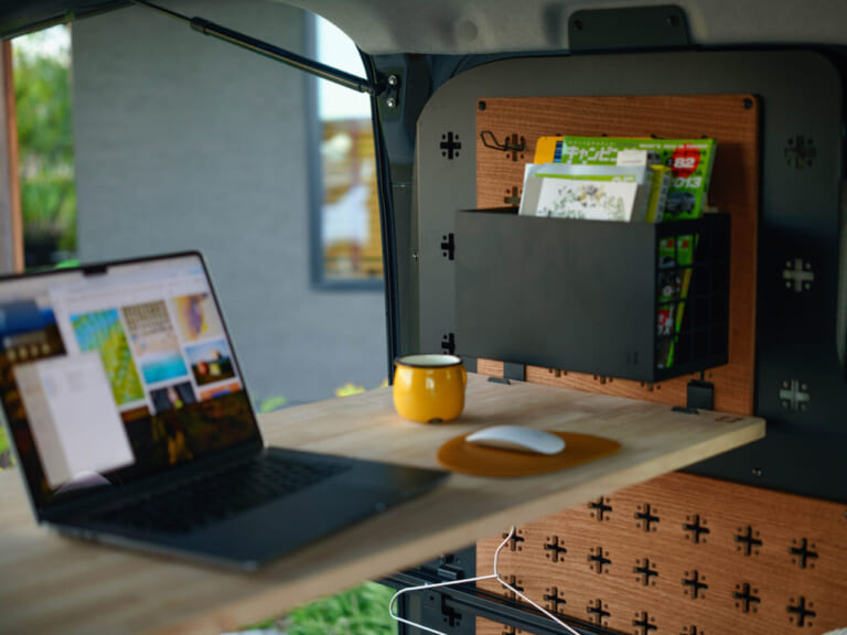 デザインはウッドとブラックスチールを基調にした、控えめでタフな佇まい。商用車にも乗用車にも違和感なく馴染むよう意識されており、車内を“作業場”にも“居場所”にも変えられる懐の深さがある。