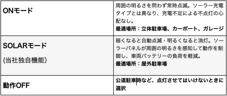 ソーラー式と違い配線式は駐車環境を選ばないのもメリットだ。充電不要で陽の当たらないガレージや立体駐車場でも高輝度点滅を維持。また駐車環境に応じて本体スイッチの切り替えにより3つのモードが選択できる。
