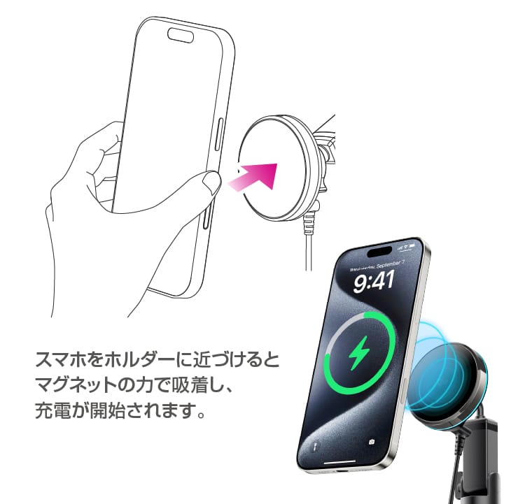 Qi2正規認証を取得した本製品は、最大15Wのワイヤレス充電に対応する。Qi2の特徴は、マグネットによって充電位置が正確に合う点にある。走行中の振動や段差でスマホがわずかに動いても、充電ポイントがズレにくく、充電効率が安定する。