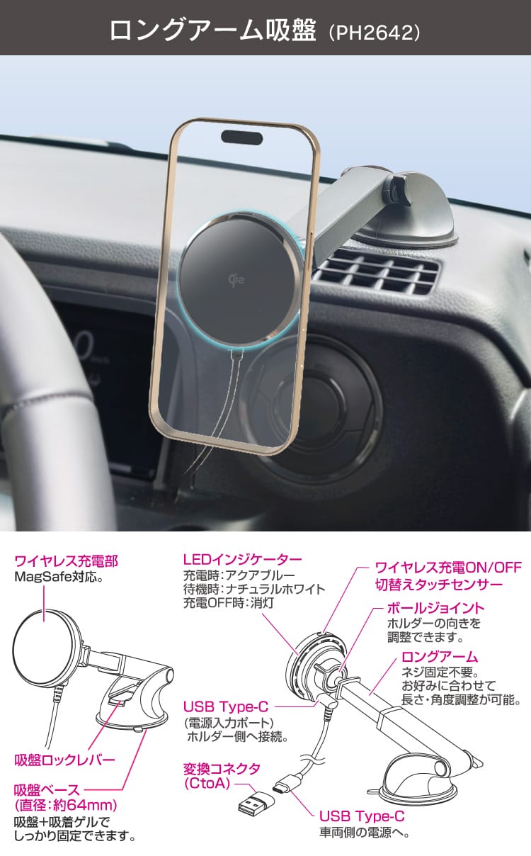 今回追加されたロングアーム吸盤タイプとドリンクインタイプにより、シリーズ全体の取付け自由度はさらに高まった。ロングアーム吸盤タイプは前後に伸縮でき、ダッシュボード上でも視界を妨げにくい位置に設置しやすい。吸盤は水洗いで吸着力が回復するため、長期使用を前提とした設計だ。