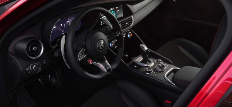 エクステリアには、カーボンミラーハウジングやカーボン加飾フロントグリルのほか、アノダイズド加工を施したブレンボ製ブレーキキャリパーとカーボンセラミックブレーキを装備。ジュリアにはさらにカーボンルーフやアクラポビッチ製エキゾーストシステムが専用装備として備わる。