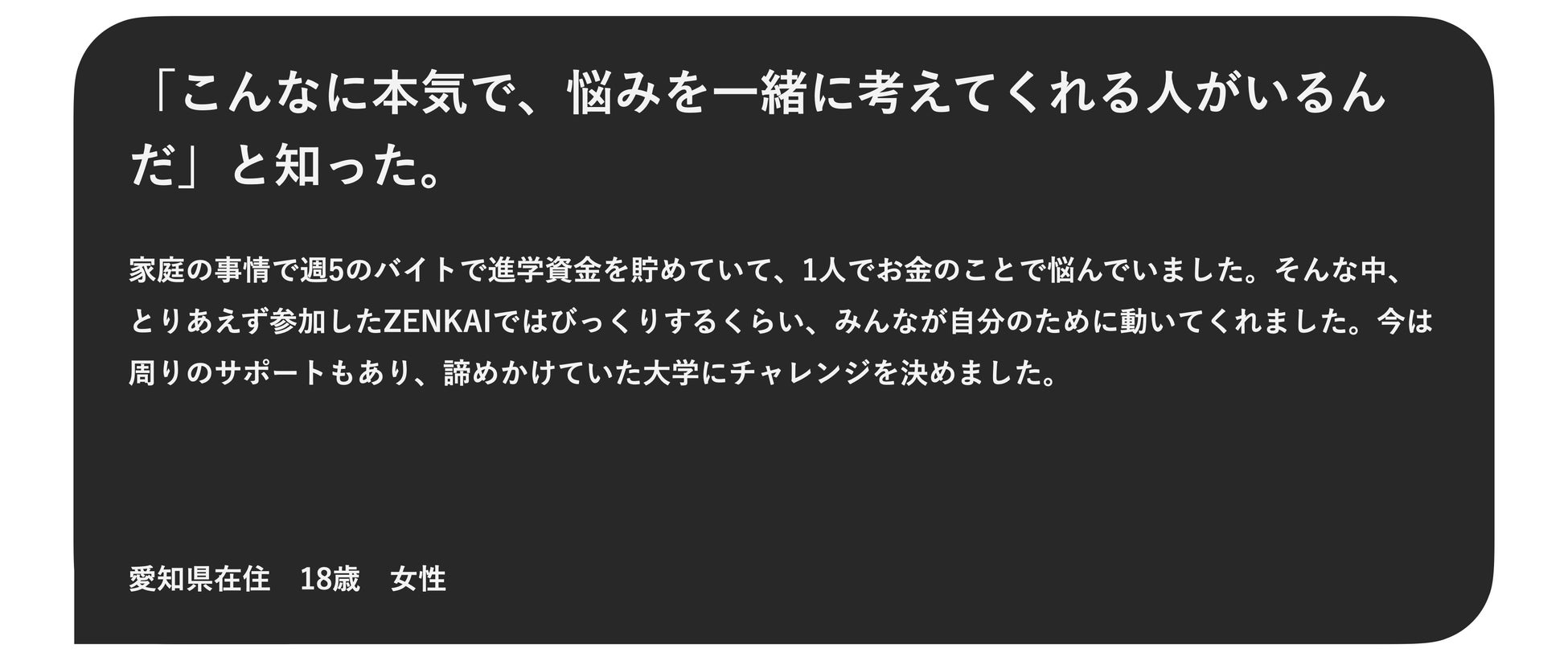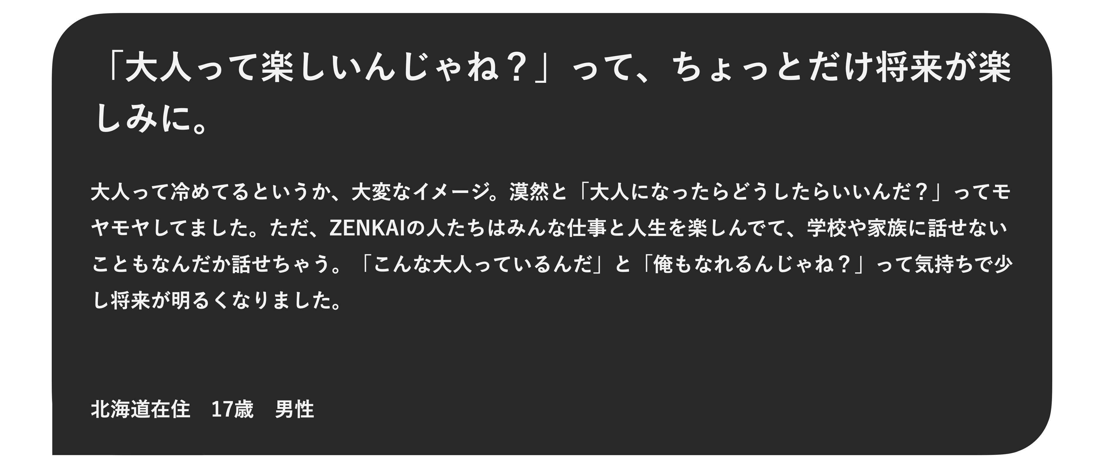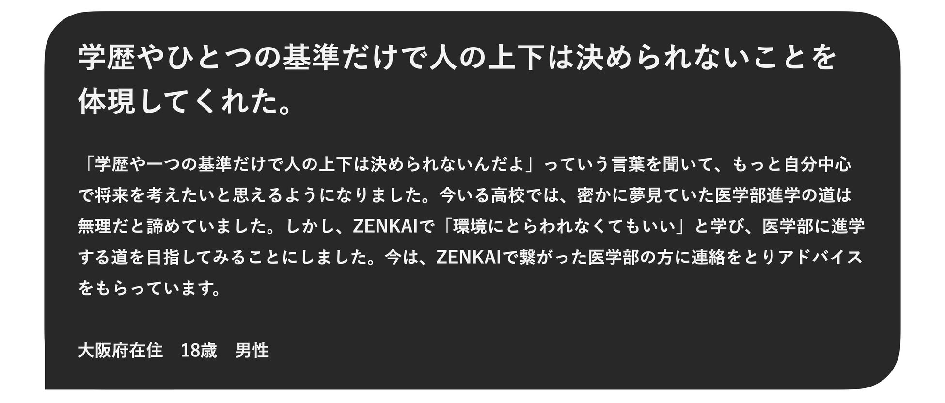 学歴や偏差値、性別、皮膚や目の色などで、人のことを勝手にわかった気にならない。ひとりひとりが持つ可能 性を絶対的に信じ、応援する。そんな社会を未来に渡していきたい。そんな思いで始まったproject:ZENKAIは、今年で2年目を迎えます。