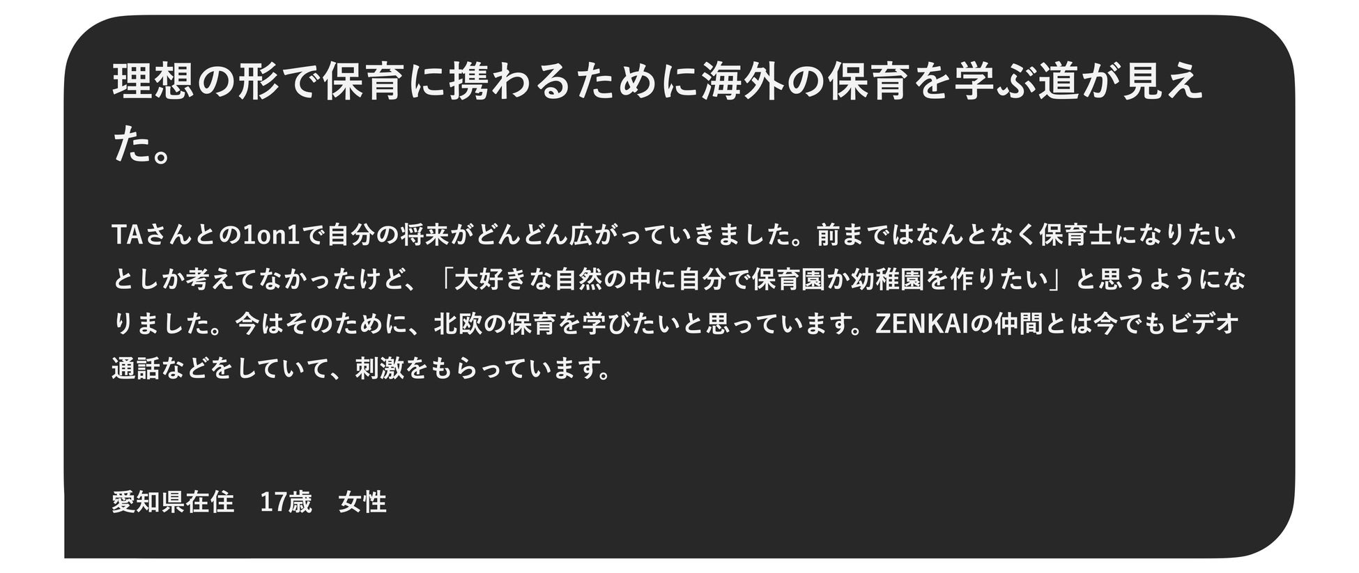1人でも多くの若者が自分自身について深く理解し、自分の可能性に蓋をすることなく、未来を切り開いていく後押しをさせていただきたいと考え、昨年から本プロジェクトを始動しました。