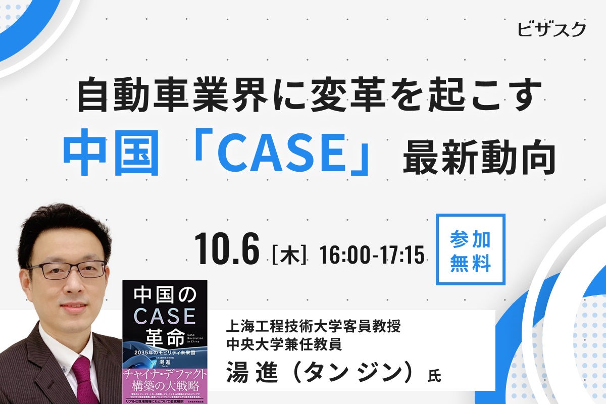 「知見と、挑戦をつなぐ」をミッションにグローバルなナレッジプラットフォームを運営する株式会社ビザスク(以下、当社)は、「中国におけるモビリティ市場の最新動向」をテーマに、上海工程技術大学客員教授、中央大学兼任教員、『中国のCASE革命 2035年の モビリティ未来図』著者である湯 進(タン ジン)氏のご登壇による無料オンラインセミナーを、10/6(木)16時より開催します。