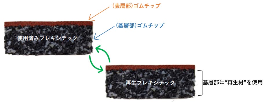 素材は、表層部はゴムチップ、基層部はゴムチップに再生架橋ポリエチレンを混合したものを使用しています。