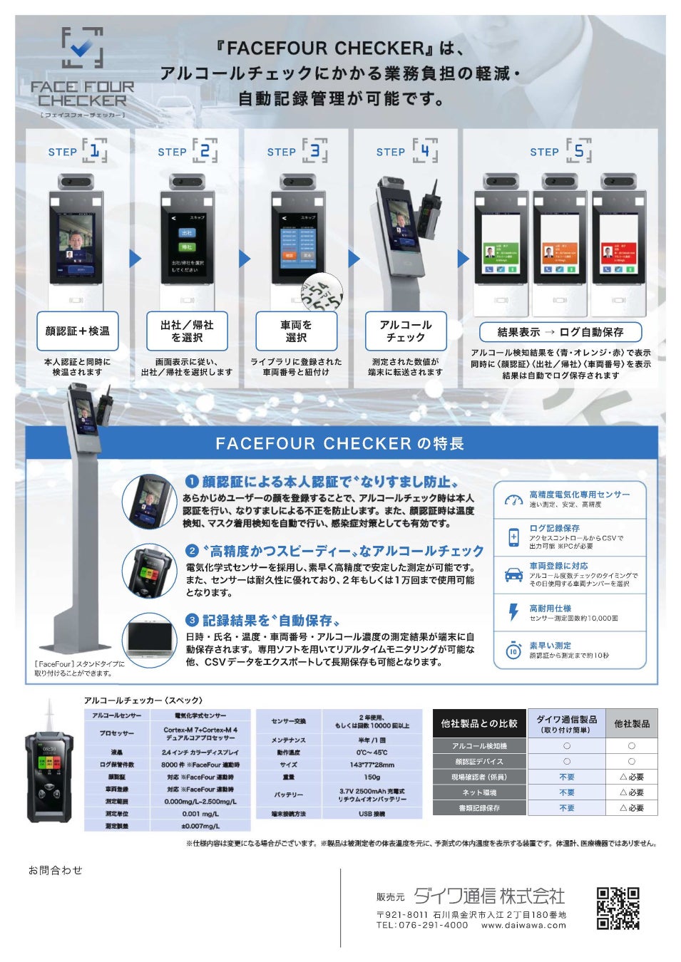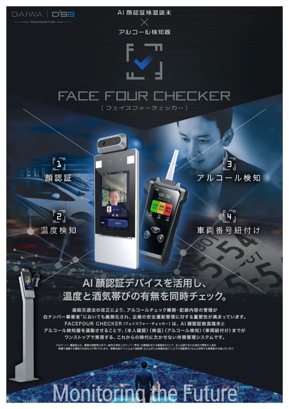 ダイワ通信株式会社(本社:石川県金沢市、代表取締役社長:岩本秀成)は、アルコールチェックと検温が同時に可能となるAI顔認証端末Face Four Checkerを新たに開発し、11月11日にリリースしました。