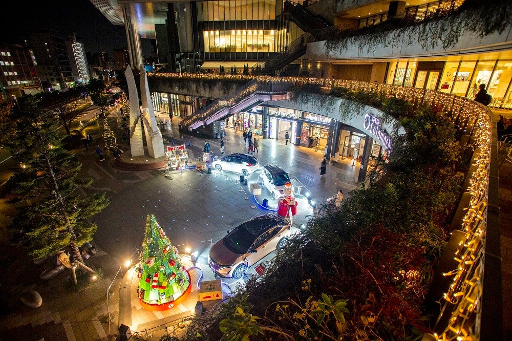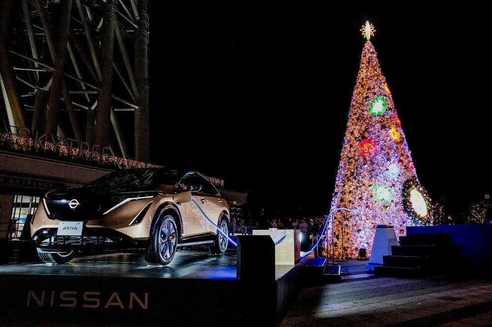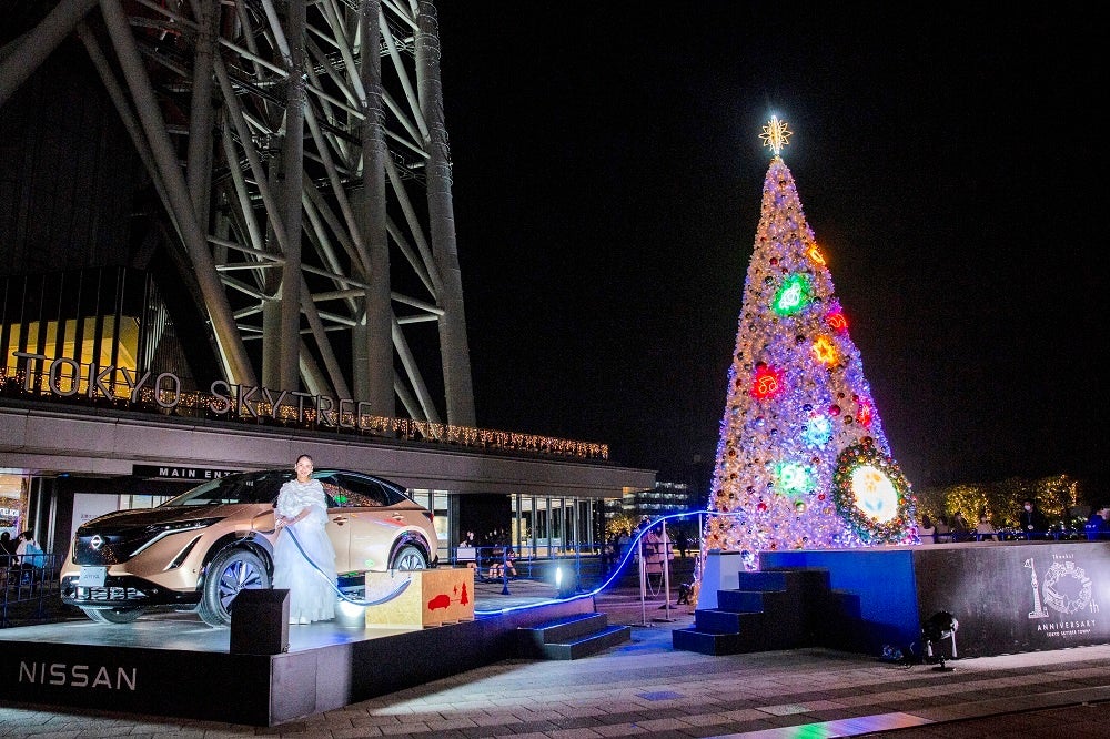 日産自動車株式会社(本社:神奈川県横浜市西区)は、東京スカイツリータウンにて2022年11月10日(木)から12月25日(日)まで開催される「東京スカイツリータウン® ドリームクリスマス2022」とコラボレーションし、「ECO&FUTURE」のテーマのもと1階のソラマチひろばにて自動車部品を一部再利用したクリスマスを彩る3種類のモニュメント展示を開始しました。また、開催初日である11月10日(木)には点灯セレモニーが4年ぶりに実施され、8mのホワイトツリーの一部の電力は電気自動車「日産アリア」から給電、ゲストに平祐奈さんが登場しました。
