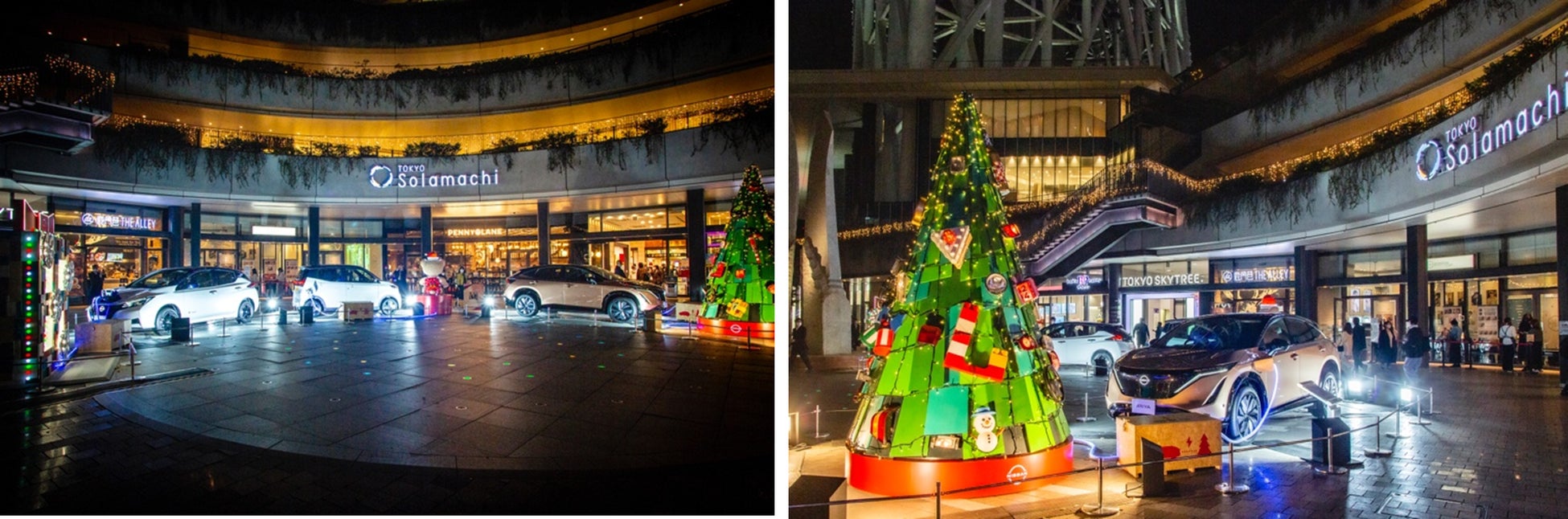 1階のソラマチひろばでは、東京スカイツリータウン®開業10周年を記念して、「ECO&FUTURE」をテーマにイルミネーションを展開します。アーティストユニットmagmaの監修のもと、ハンドル、ライト、ホイールなど日産車の部品を一部再利用し、クリスマスを彩る3種類のモニュメントを展示。ライトアップのための電力は電気自動車「日産リーフ」、「日産アリア」、「日産サクラ」によって供給されます。