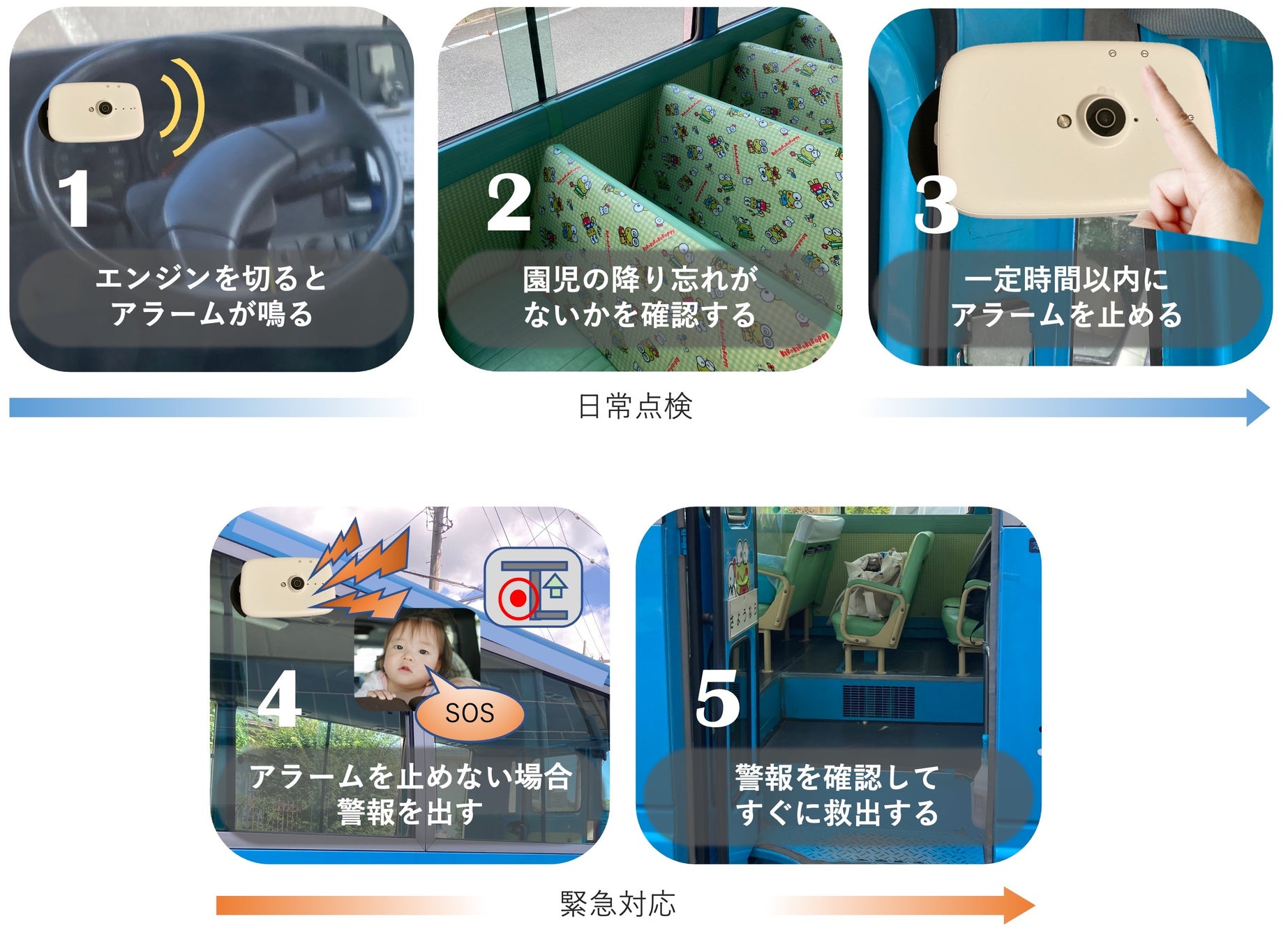 声が出せない状況でも姿が見える、姿が見えなくても声が聞こえる、姿が見えず声が聞こえなくても発信地が特定できるため、置き去りに気付くことが可能な仕組みです。