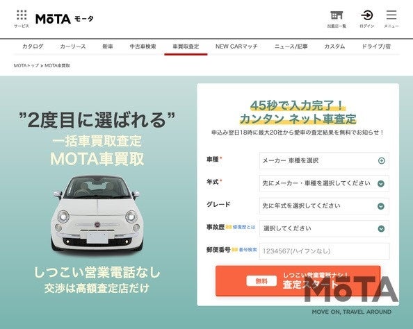 MOTAは、愛車の売却をご検討の方に、複数の買取店に一括で買取査定ができるサービス「MOTA車買取査定」を提供しています。
