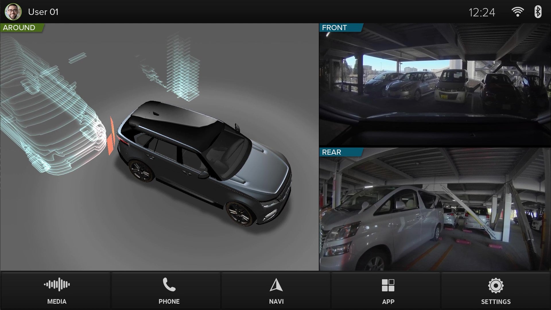また、LiDAR(Light Detection And Ranging)の使用を想定した駐車アシストのHMIのデモも展示します。LiDARは、レーザー光を照射し、その反射光を観測することで、対象物までの距離や形状を観測できる装置です。このようなHMIを使用することで、カメラ映像だけではわかりにくい奥行きの情報などの車両周辺の状況を、より詳しくドライバーに伝えることができます。