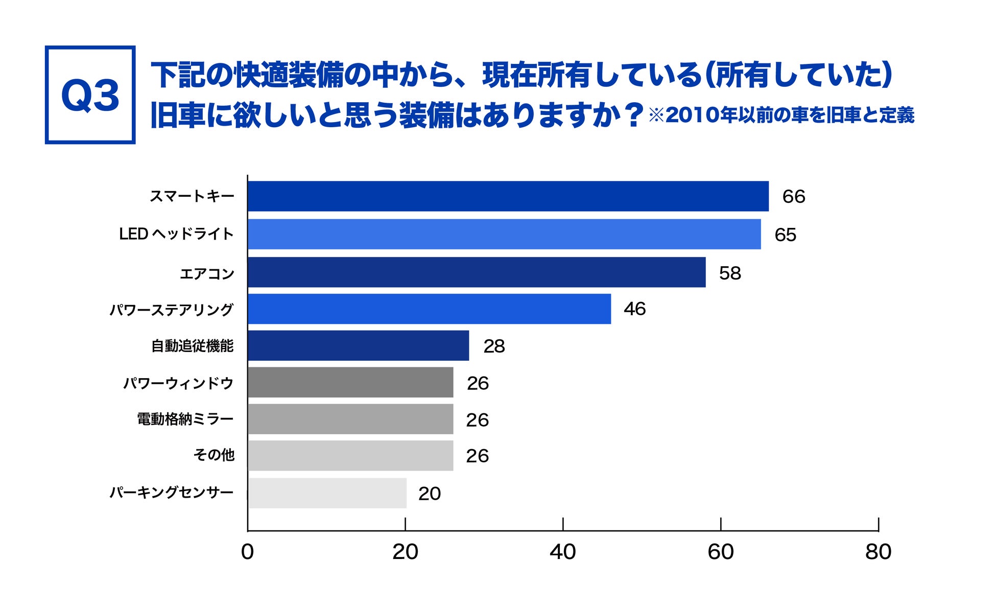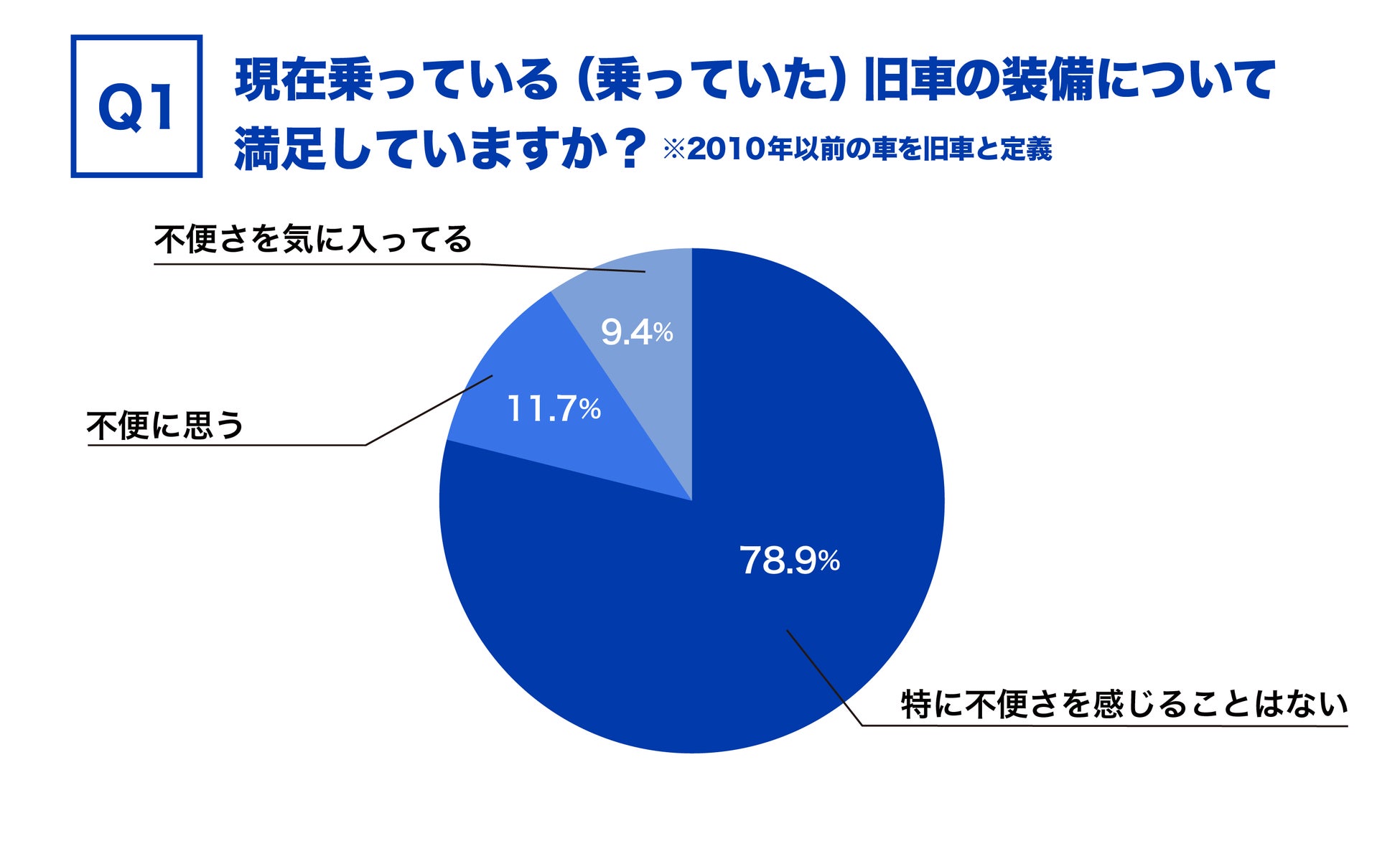 ・調査内容:Q1.現在乗っている(乗っていた)旧車の装備について満足していますか?※2010年以前の車を旧車と定義 Q2.旧車の装備と聞いて思い浮かぶものはなんですか?※2010年以前の車を旧車と定義※複数回答可 Q3.下記の快適装備の中から、現在所有している(所有していた)旧車に欲しいと思う装備はありますか?※2010年以前の車を旧車と定義