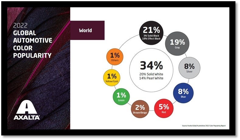 アクサルタ社のロバート・シュネル(グローバルセールス&プロダクトマネジメント担当バイスプレジデント)は、次のように話しています。「今の自動車は、かつてないほど活気であふれています。例えば、車体のホワイト色は、1950年代のホワイト色のバリエーションより明るく、干渉色のフレークによって輝きを放っています。現在、路上を走行する自動車の82%が、ホワイト、ブラック、グレー、シルバーのいずれかの色で塗装されています」。