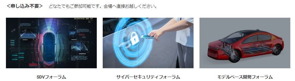 加えて、今年は自動車業界で重要度が増している、SDV/モデルベース開発/サイバーセキュリティに関する無料セミナーを展示会場内で実施します。トヨタ自動車(株)が「クルマ社会の安全・安心のために、Japan Automotive ISACの取組み」を、シーメンス(株)が「デジタルツインで実現する 車両統合性能」、(株)アドバンスド・データ・コントロールズが「SDV検証に欠かせない仮想外界環境のご紹介」、dSPACE Japan(株)が「データドリブン開発:コード中心の開発からデータ中心の開発へ」といったテーマで講演。他社事例や最新動向を知ることができる絶好の機会となります。