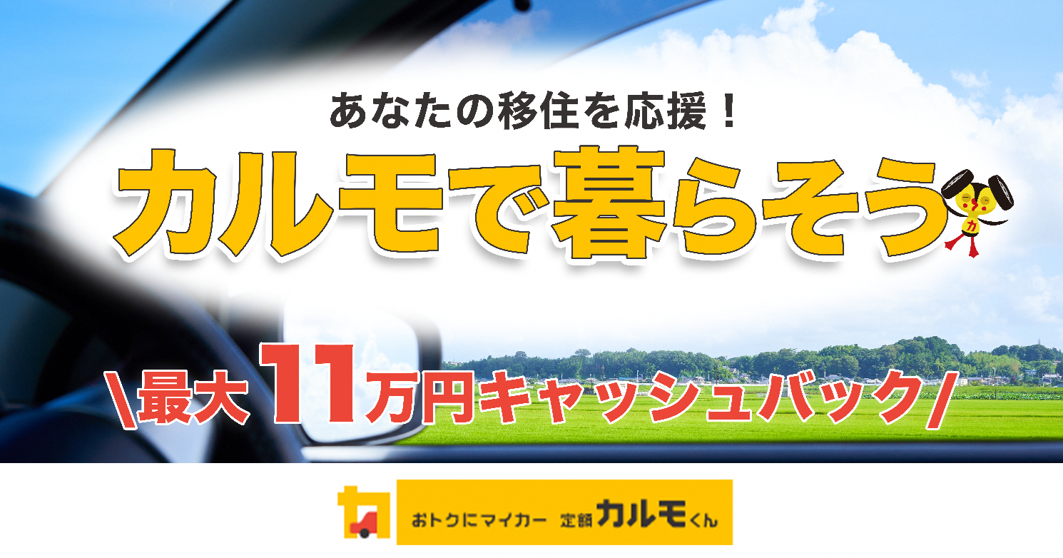 静岡県への移住定住を機に、カーリースサービス「定額カルモくん」をご契約いただいた方に、移住応援金として最大11万円をキャッシュバックいたします。