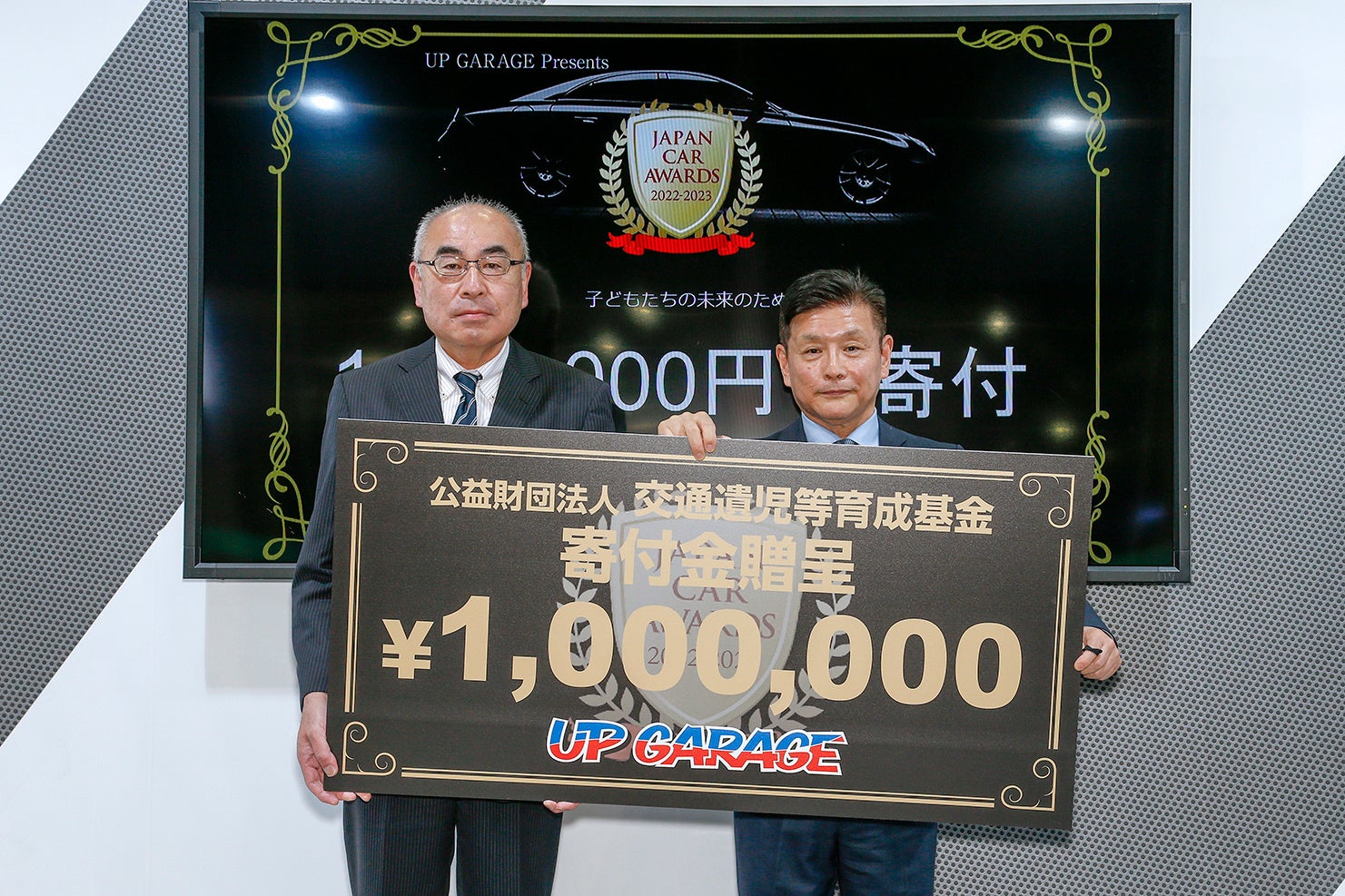 また、昨年に引き続き今年もSDGsの取り組みの一環として、投票数×1円を、公益財団法人 交通遺児等育成募金へ寄付いたしました。寄付金は当社の寄付と合わせて100万円とし、授賞されたメーカー様、そして投票して下さったユーザーの皆様とともに、交通遺児の方々を支援するという思いを込め、公益財団法人交通遺児等育成基金 常務理事 手島和幸様へ目録として謹呈いたしました。