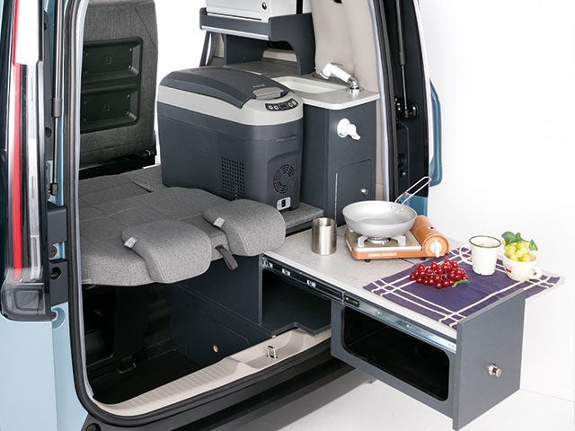 電子レンジ、シンク、バーナーといった調理を楽しむための装備付き。