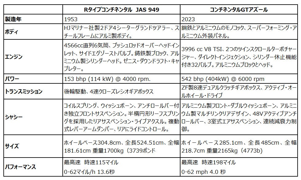 マリナーのパーソナルコミッショニングガイドを使用した新型コンチネンタルGTアズールは、ベントレーの43台のヘリテージコレクションの中で最も象徴的な一台へのオマージュとして製作されました。JAS 949はベントレーが所有するRタイプコンチネンタルで、クルーにあるカーボンニュートラルなベントレーのキャンパスに新しくオープンしたヘリテージガレージに保管されています。ベントレーは2001年にJAS 949を取得し、その歴史を大切に保存しながら、機械的にも良好な状態を維持してきました。この車は定期的に公道で運転されています。