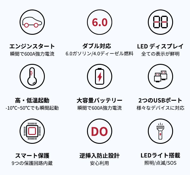 10,000mAh/12,000mAh大容量バッテリーを使用しており、フル充電で約50回始動できます。