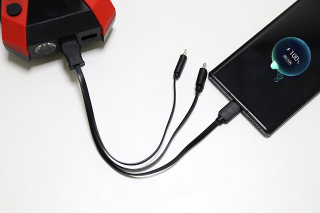 2つのUSB 出力端子を搭載し、モバイルバッテリーとして使用可能。また、様々なスマートフォンやタブレット、電子機器の充電が可能な多用途3-in-1充電ケーブルが付属しています。