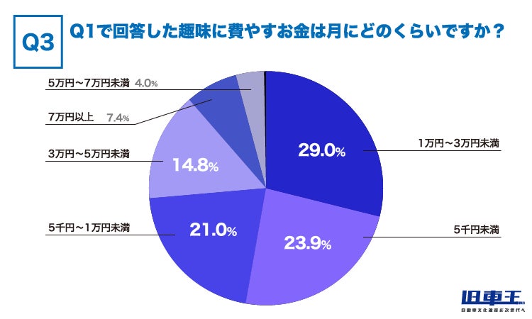 Q1で回答した趣味に費やすお金は月にどのくらいか聞いてみると、1位が「1万円〜3万円未満」で29.0%、2位が「5千円未満」で23.9%、3位が「5千円〜1万円未満」で21.9%という結果になりました。