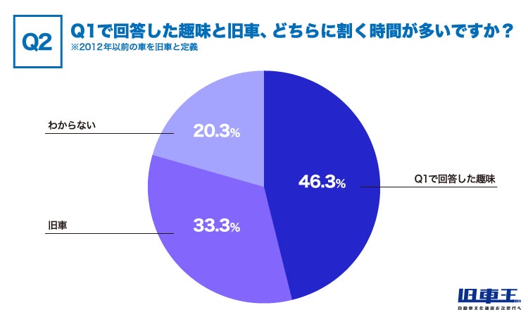 Q1で回答した趣味と旧車どちらに割く時間が多いか聞いてみると、「Q1で回答した趣味」が46.3%、「旧車」は33.3%という結果でした。