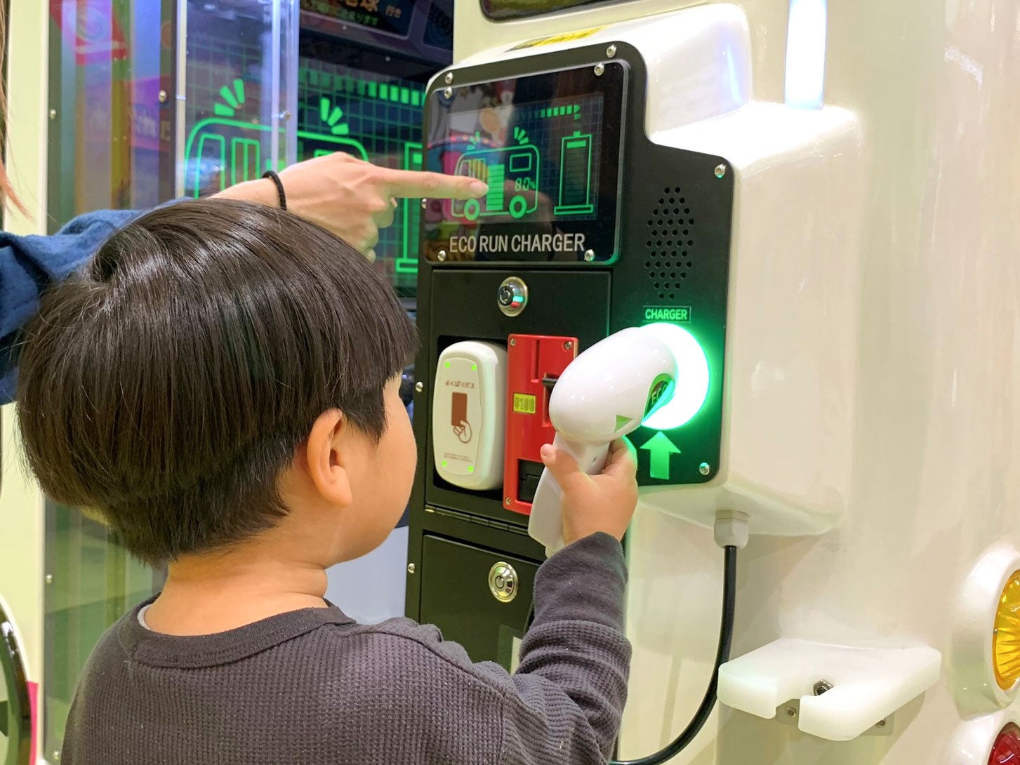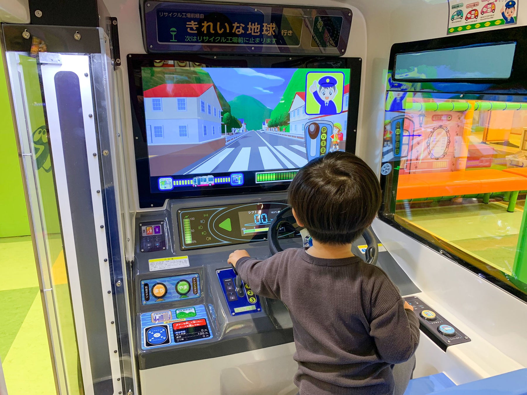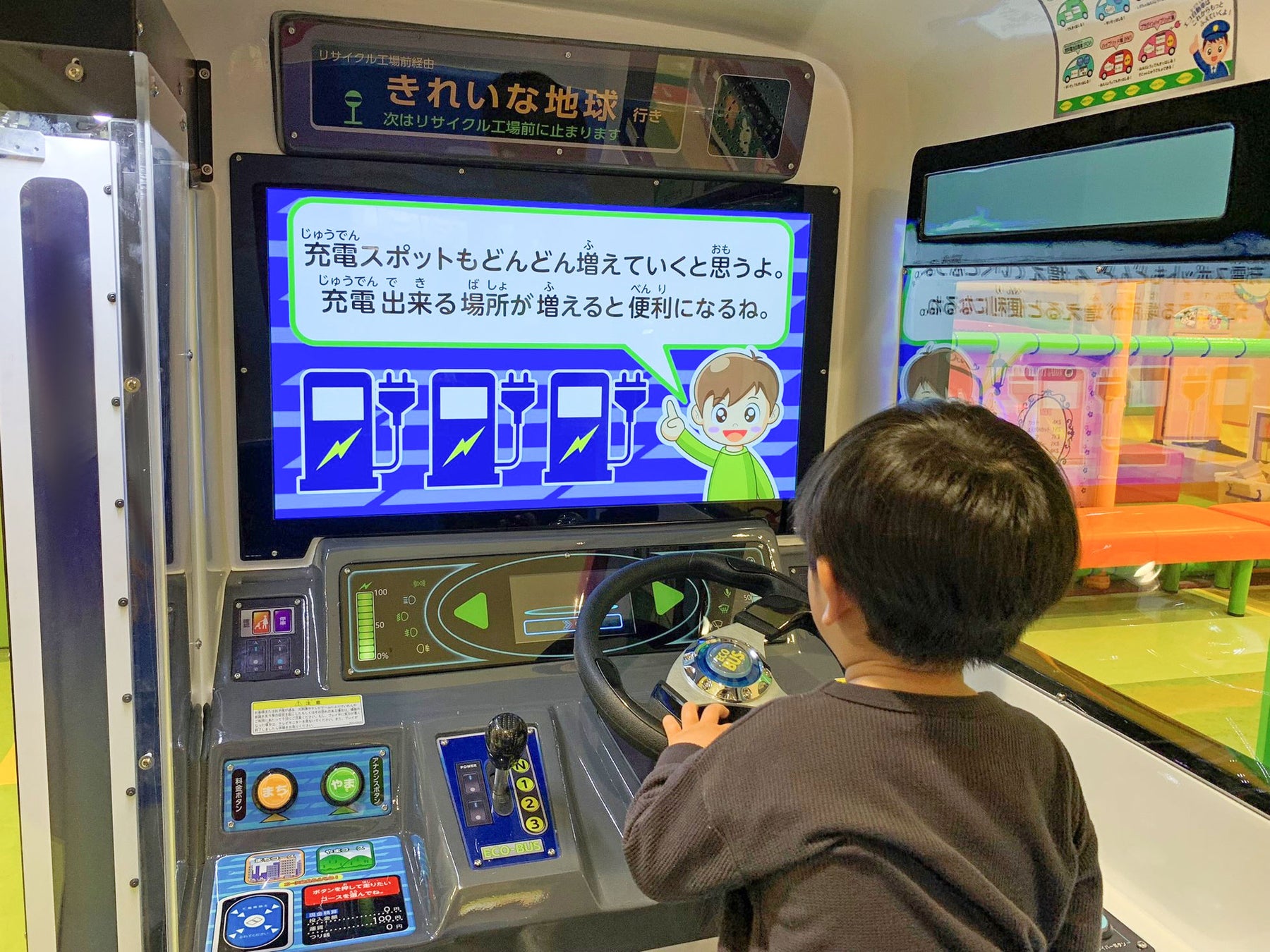 楽しくバスの運転をしながら、シフトレバーを操作して場所やタイミングにあった走らせ方をしたり、様々な環境にやさしいエコ自動車について学べたりできるキッズ向けエデュテイメントゲームとなっています。バスに乗り込む前にエネルギーをチャージし、画面に沿って運転操作をして街や森の中を走ります。運転中はバスの筐体が動くので、本当に乗り物を動かしているような気分で遊ぶこともでき、最後にはエコ運転度の結果発表があったり、環境にやさしいエコ自動車について紹介する内容も登場したりします。