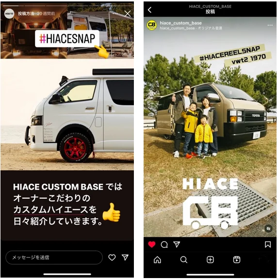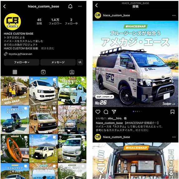 22年10月より先行スタートしているInstagramアカウント ”@hiace_custom_base” では、様々なハイエースオーナー様のこだわりが詰まったカスタムスタイルをスナップ形式で発信しており、14,000人以上の方々に楽しんでいただいております。