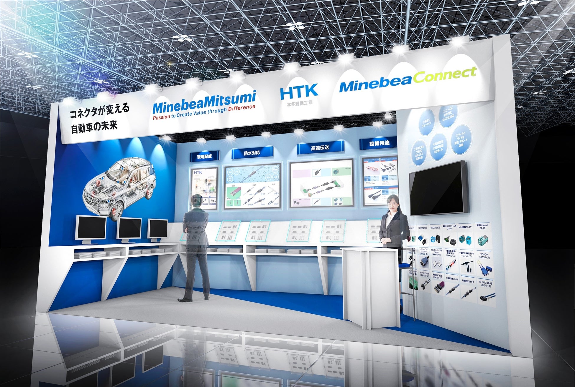 ディスプレイやECU、TCUなどの、さまざまな機器間接続に利用可能な、防水対応品の48極として業界最小クラスの電線対基板コネクタ KB01シリーズや、高速伝送品の最大9GHz Mini 同軸 シリーズを初出展するほか、接続バリエーションが豊富な車載カメラ用コネクタ TACシリーズ、車内ネットワークの高速化等に向け、現在開発中の6/12Gbpsの小型LVDSコネクタ TAHシリーズやEthernet シリーズ等も参考出品としてご覧いただくことで、ミネベアミツミグループのコネクタで車載関連の配線が全て対応可能であることを実感いただけます。