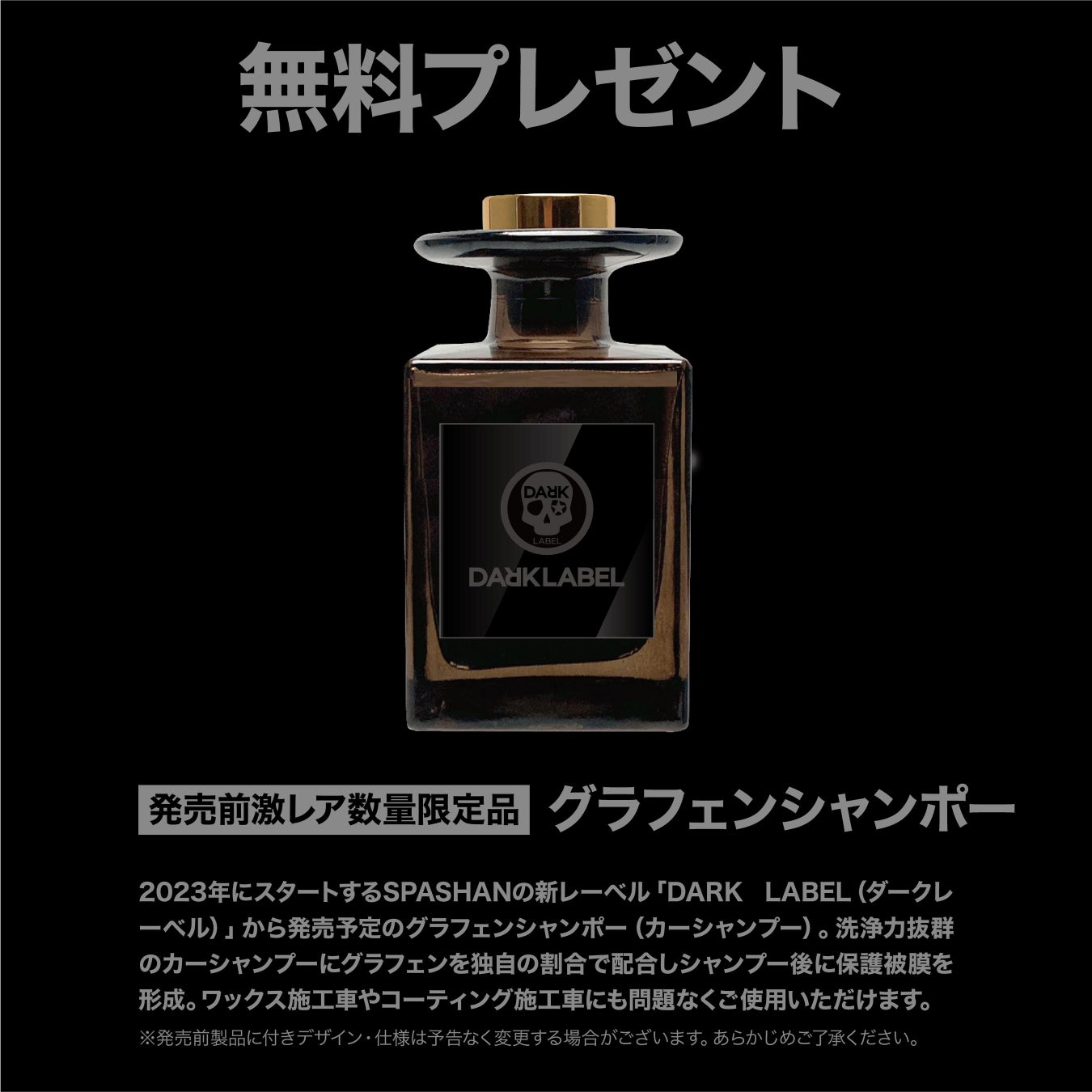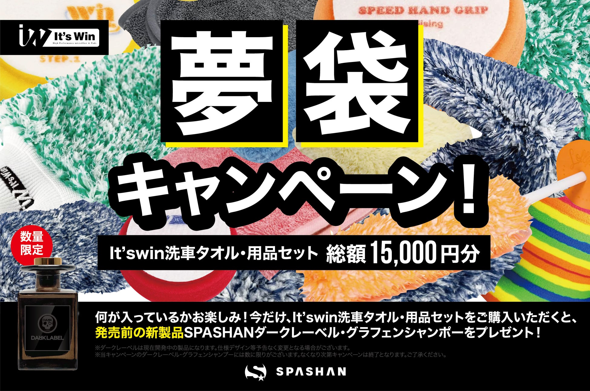 今だけ限定、It’s Win梅雨の夢袋洗車セットをご購入いただくと発売前の新製品、新しいラインのSPASHANダークレーベル「グラフェンシャンポー」をプレゼントいたします。