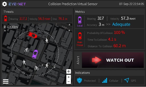 Eye-Zone™はEye-NetのLinuxベースのソリューションであり、自動車業界(OEM、Tier 1、Tier 2サプライヤー)向けにEye-Net独自のV2X技術を提供しています。主な機能とては、ドライバー向けの衝突可能性の検知や、警告による事故防止ソリューションが備わっています。Eye-Zone™は独自の仮想センサーであるRUDAR™(Road Users Detection and Ranging)を使用し、車両周辺の道路利用者の位置情報、移動特性、衝突の危険性をリアルタイムで点群データとして提供します。Eye-Zone™はADAS、ナビゲーションシステム、インフォテインメントシステム等、様々な車載システムに簡単に統合することができます。